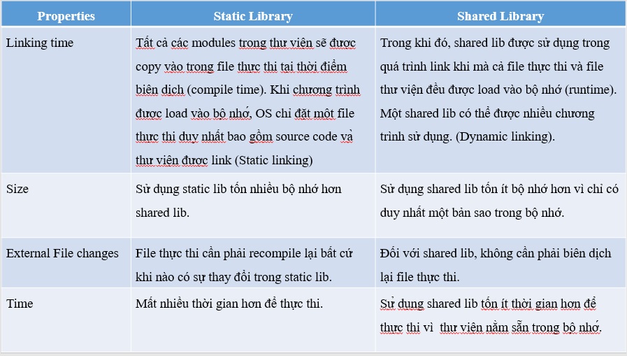 - Sử dụng static lib tốn nhiều bộ nhớ hơn shared lib.