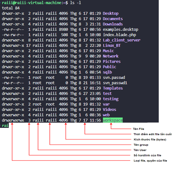 Directories File (File thư mục): Trong Linux, thư mục cũng được coi như là một loại file. Thư mục chứa danh sách các file khác và thư mục con. Nó giúp tổ chức và quản lý file một cách hiệu quả. Ví dụ: Thư mục /home/username chứa các file và thư mục con của người dùng, hoặc thư mục /etc chứa các file cấu hình hệ thống.